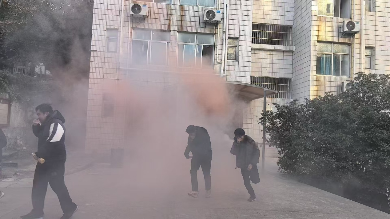 下午3:00,毓竹公寓院内警报拉响,辅导员们迅速到各宿舍楼梯口疏散引导。同学们按照预定的疏散路线,捂住口鼻、弯腰低姿,有序撤离到广场集结,整个疏散过程紧张而有序,仅用了不足五分钟。随后,张建发详细讲解了手提式干粉灭火器正确的使用方法,并进行现场展示。接着,部分师生在张建发的指导下,进行灭火器实践演练。