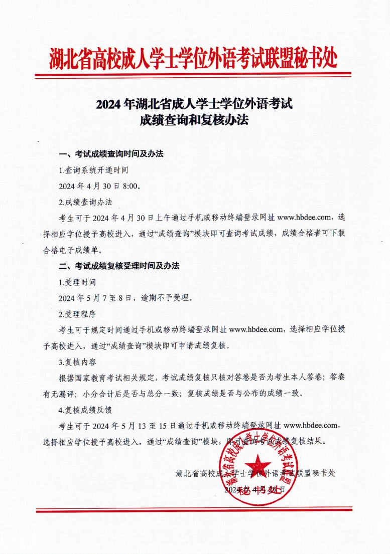 2024年湖北省成人学士学位外语考试成绩查询和复核办法